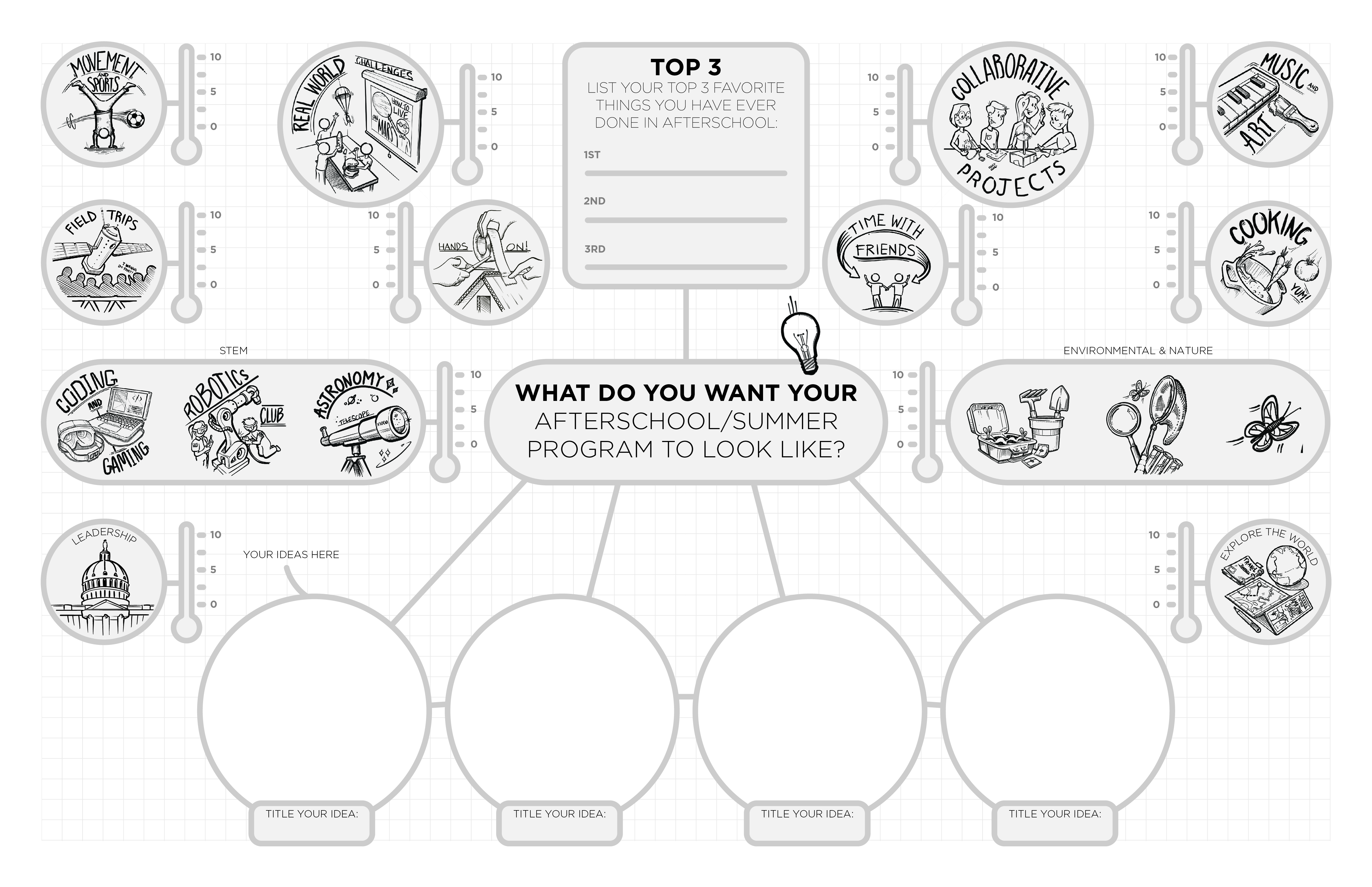 Afterschool and summer programs work best when youth want to be in these programs. That is why Beyond School Bells asked over 150 young people participating in after school and summer programs to identify the learning opportunities and experiences they enjoy most in their programs. Instead of a typical questionnaire, BSB created an interactive brainstorming exercise to gather ideas. This engaging process provided valuable insight into what Nebraska youth currently enjoy and what they envision the afterschool and summer programs of the future could be. You can run your own Youth Brainstorming Sessions to gather the ideas of youth in your program. Check out the Youth Brainstorming Sheet template and facilitator guide below.
